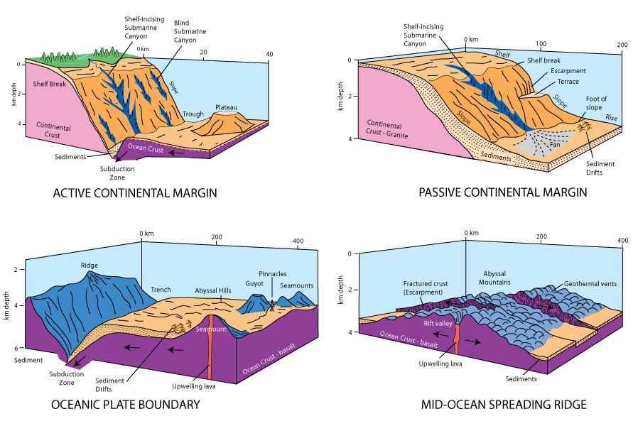 a mapping representation of active and passive continental margins, oceanic plate boundaries and mid ocean spreading ridges