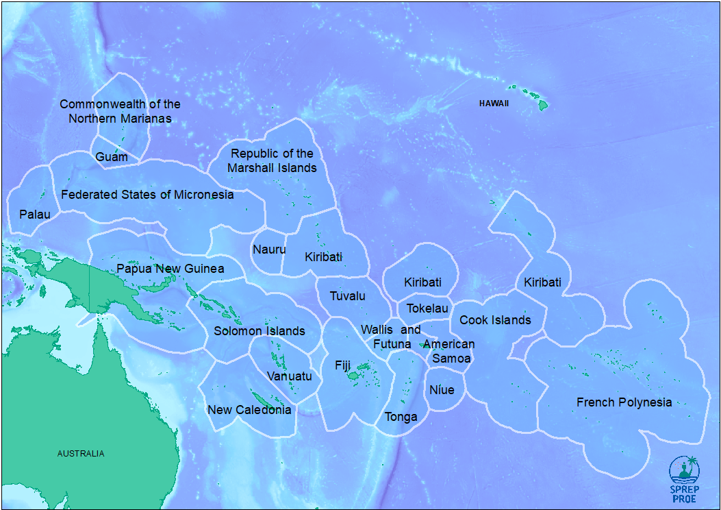 The map is low resolution showing SPREP member countries' Exclusive Economic Zone (EEZ) boundaries overlaid on a bathymetric base layer that was developed by the GIS team at SPREP.
